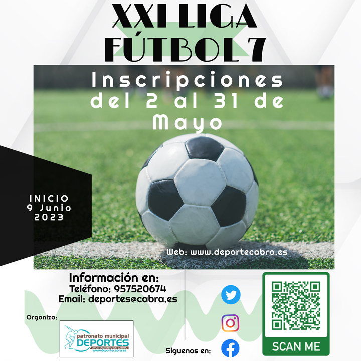 El Patronato Municipal de Deportes del Ayuntamiento de Cabra como organizador de la Liga de Fútbol-7, abre el período de inscripción de equipos, que se podrá realizar a través del formulario web que está incluido en la página del P. M. D.: www.deportecabra.es/competiciones.