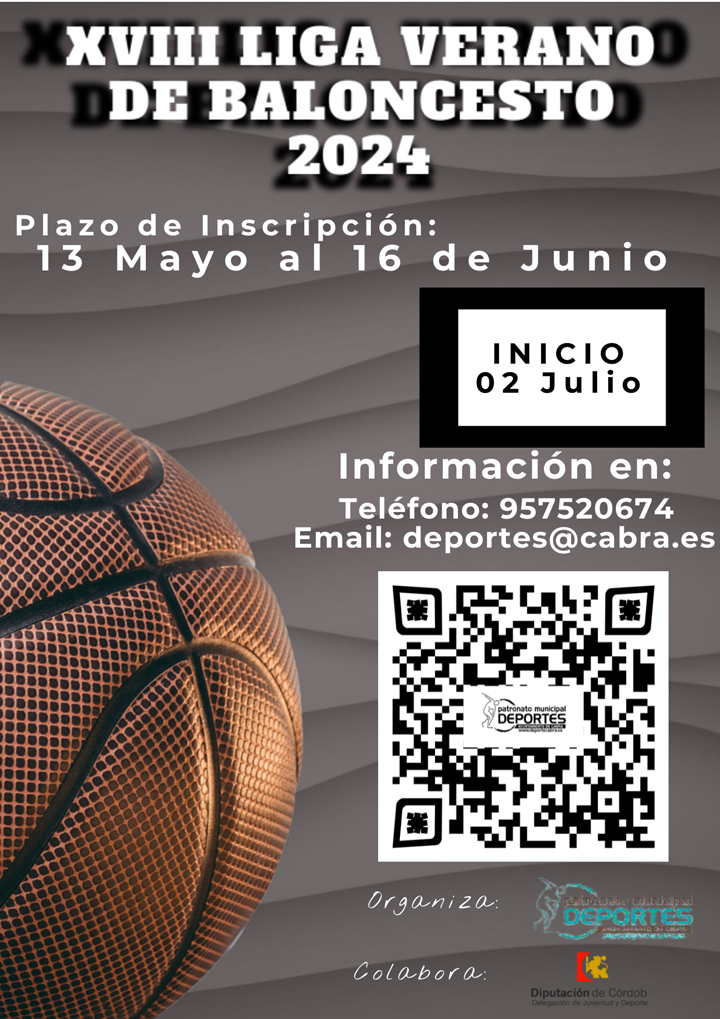 La XVIII edición de la liga de Verano de Baloncesto de Cabra, se pone en marcha con la apertura del plazo de inscripciones de equipos entre los días 13 de mayo al 16 de junio, ambos inclusives. Los equipos interesados deberán rellenar el formulario web, a través de escanear el código QR que aparece en el cartel.