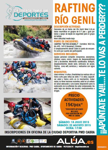 Una vez completadas las 48 plazas disponibles para el Raffting del sábado día 22, el Patronato Municipal de Deportes en colaboración con la empresa Alúa ha preparado un nuevo grupo para desarrollar esta misma actividad para el domingo día 23. Los participantes de este nuevo grupo podrán además hacer uso de la Piscina del Camping Benamejí, una vez finalizada la actividad. El precio será igualmente de 15 € por persona. Los inscritos deberán estar en el Camping de Benamejí entre las 9.15 y las 9.30 horas de dicho día.