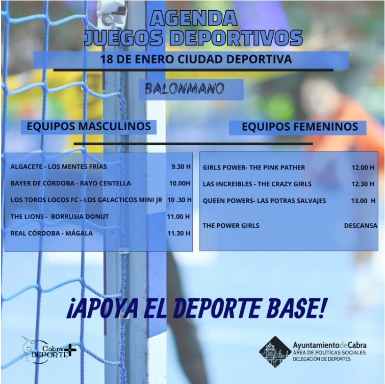 En esta página os dejamos las deferentes opciones que tendrán los aficionados al deporte de formación de nuestra Ciudad para asistir y animar deportivamente a todos los equipos que representarán a Cabra en sus encuentros federados.