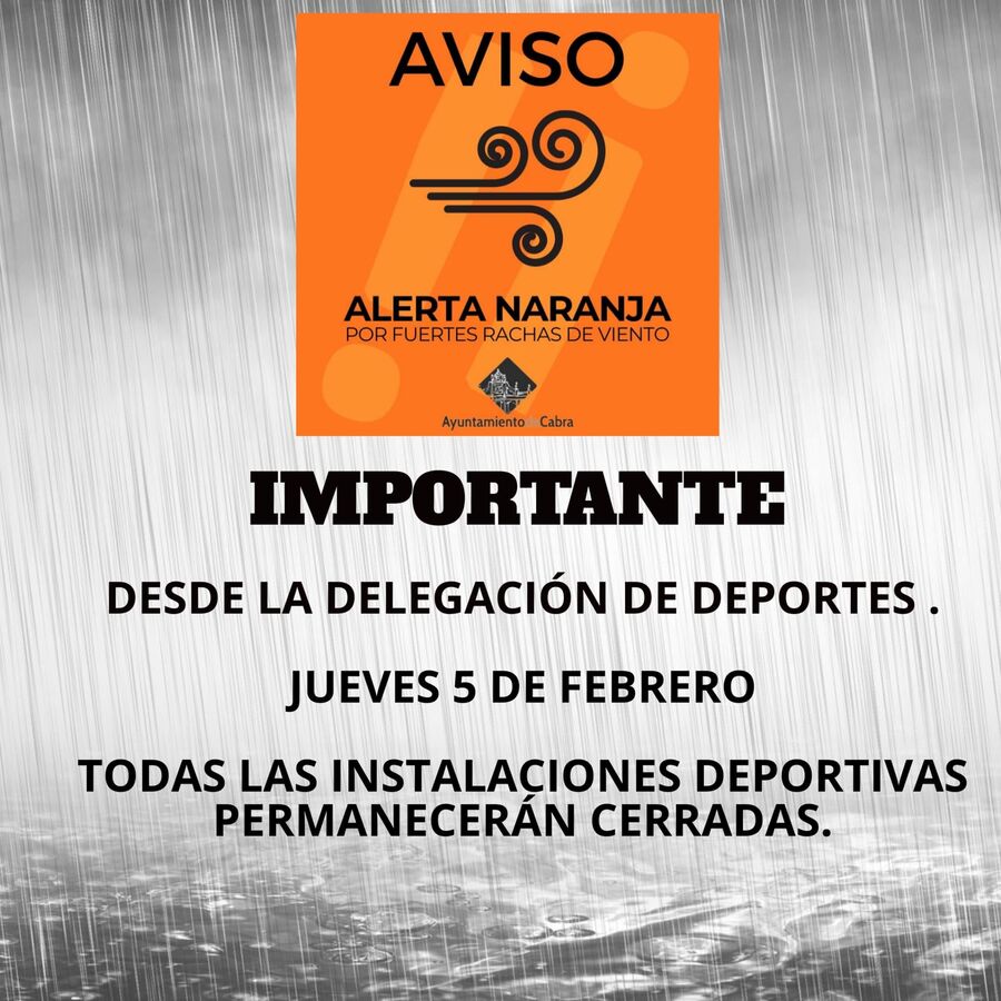 Desde la Delegación de Deportes se informa que el jueves 5 de febrero todas las instalaciones deportivas municipales permanecerán cerradas, como medida preventiva ante la situación meteorológica adversa.