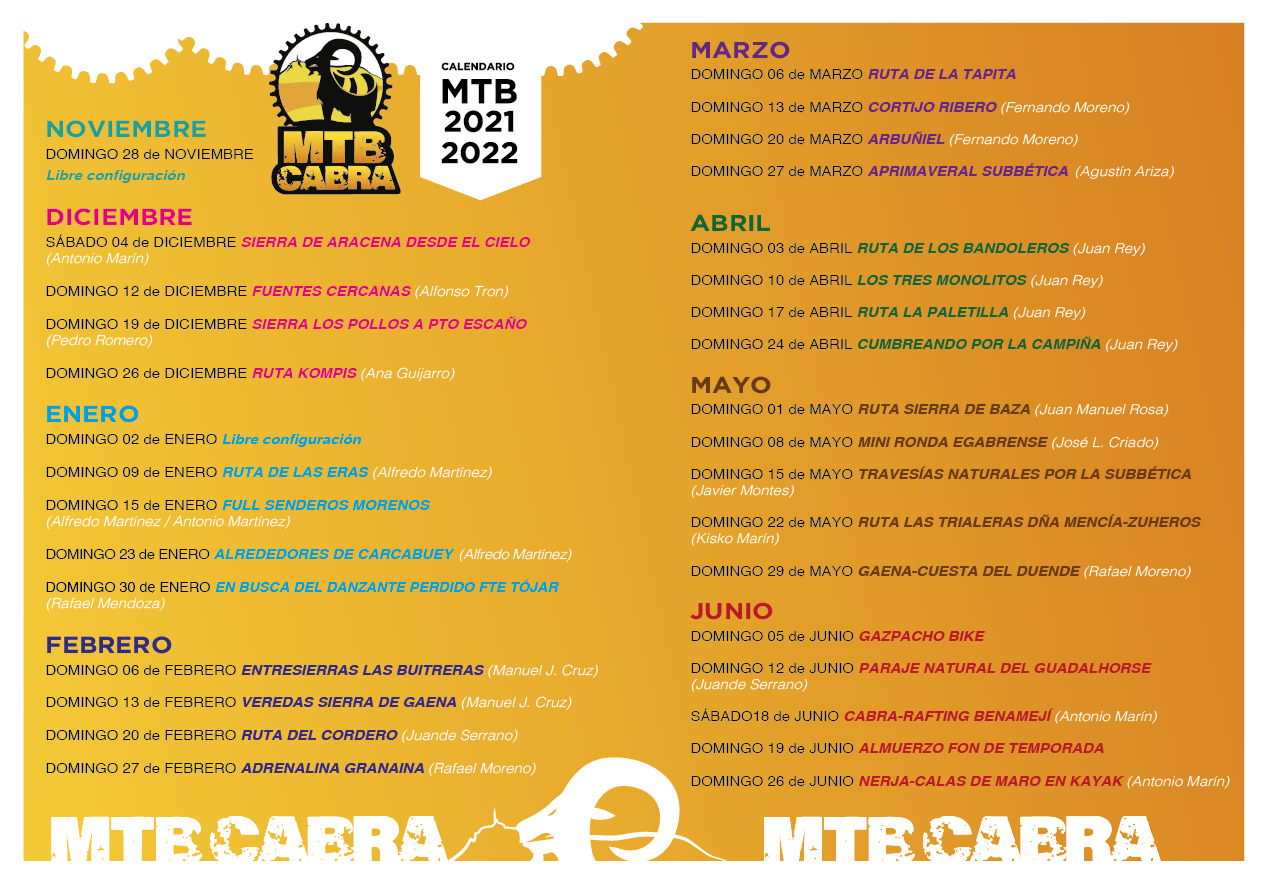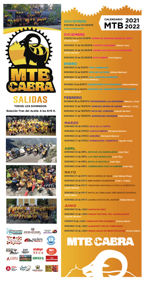 El Club Egabrense MTB-Cabra nos presenta su propuesta de Salidas en Mountain Bike para la presente temporada. Un calendario con una extensa variedad de Rutas que están encuadradas dentro del Calendario que desde Noviembre al próximo mes de Junio están abiertas a cualquier participante que lo desee.