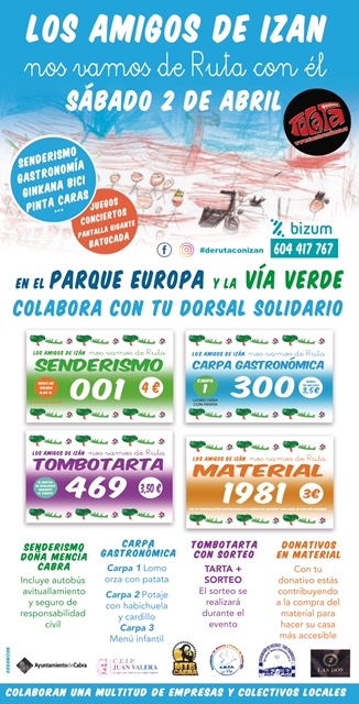 El próximo sábado día 2 de Abril tanto en el Parque Europa como en la Vía Verde se reunirán los amigos de Izam para compartir con él todas esas actividades de las que disfrutan habitualmente. Las zonas elegidas han sido el Parque Europa y la Vía Verde, donde se concentrarán actividades de todo tipo.
