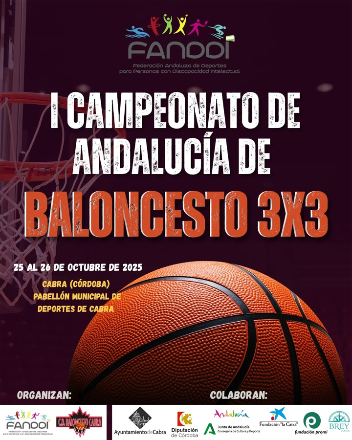 La Fundación Andaluza del Deporte para Discapacitados Intelectuales, junto con el Club Baloncesto Cabra, organizan en colaboración con el Ayuntamiento de Cabra, la Diputación Provincial de Córdoba, la Junta de Andalucía y diversas entidades privadas el I Torneo de 3 x 3 de Baloncesto en Cabra durante los días 25 y 26 de Octubre.