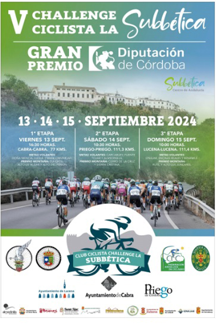 La V Challenge de Ciclismo se celebra este próximo fin de semana recorriendo desde el viernes 13 de septiembre, algunas de las localidades que componen la comarca de la Subbética. La prueba, organizada por el Club Challenge de la Subbética con la colaboración de los ayuntamientos de Cabra, Lucena y Priego, así como diferentes entidades públicas y privadas, contará con la participación de 26 equipos.