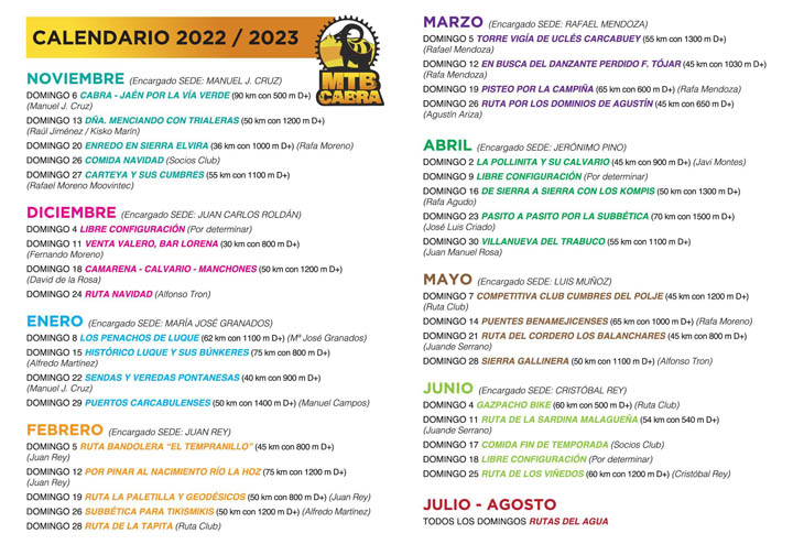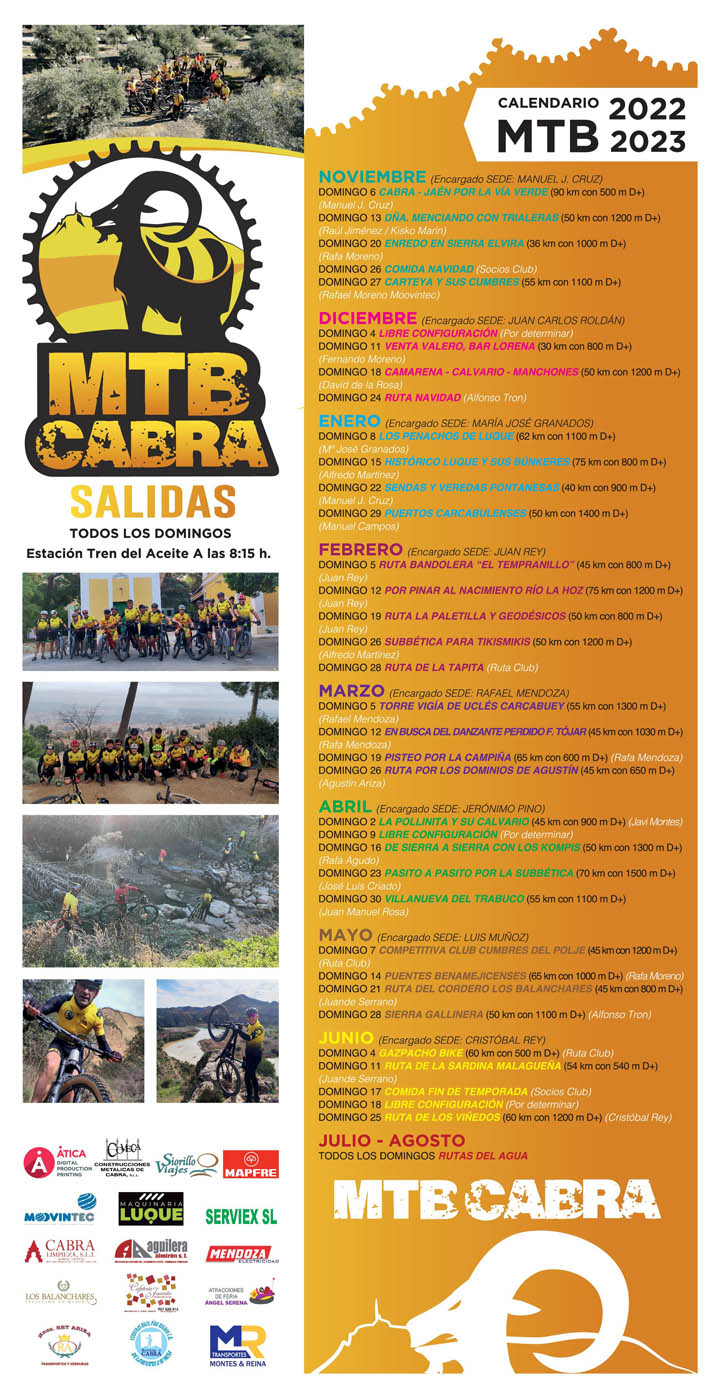 El Club M. T. B. de Cabra nos presenta su Calendario de Rutas en Bici de Montaña, que desde el pasado mes de Noviembre ha estado en funcionamiento cada domingo y que ahora con la llegada de un tiempo con otra temperatura, hace que muchos de nosotros salgamos a pedalear. Pues que mejor que hacerlos con expertos conocedores de las Rutas más atractivas que nos rodean en la Comarca.