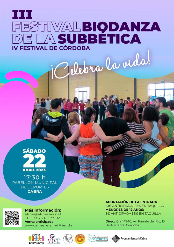 El sábado 22 de abril se desarrollará en el Pabellón Municipal de Deportes de Cabra el III Festival de Biodanza de la Subbética Cordobesa (IV de la provincia de Córdoba), dentro de las actividades organizadas por la Federación Internacional de Biodanza - Sistema Rolando Toro - y en colaboración con el Patronato Municipal de Deportes de Cabra.