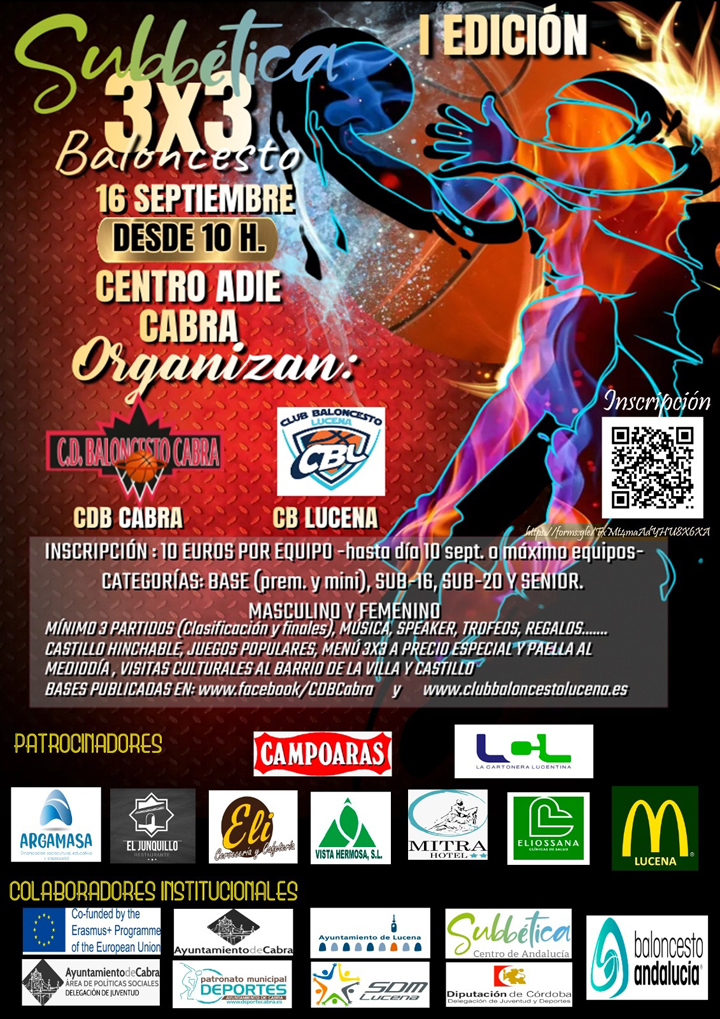 El sábado 16 está señalado en el calendario como el día de la celebración de la I edición del Torneo 3 X 3 de Baloncesto de la Subbética, organizado por los Clubes, Baloncesto Cabra y Baloncesto Lucena, en colaboración con los Ayuntamientos y Patronatos de ambas ciudades así como el apoyo de diversas firmas privadas que se unen a este proyecto común entre Cabra y Lucena.