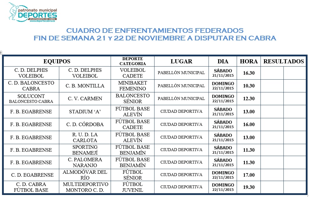 Voleibol, Baloncesto y Fútbol, componen el cuadro de encuentros deportivos que se celebrarán en las instalaciones municipales durante el próximo fin de semana 21 y 22 de Noviembre. Diversas categorías desde Benjamines hasta sénior serán las protagonistas de dichos encuentros recibiendo visitas de localidades como Benamejí, Montilla, Montoro etc, así como algunas barriadas cordobesas. Suerte a todos.