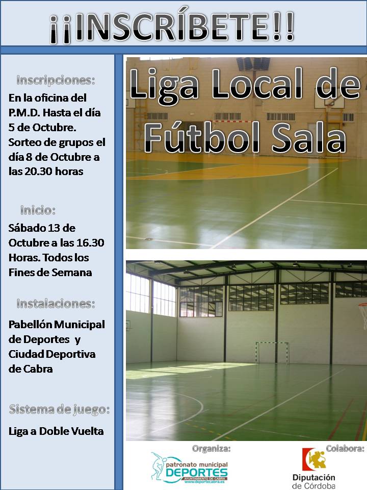 Hasta el próximo día 5 de Octubre está abierto el plazo de inscripción en la Liga local de Fútbol Sala de categoría absoluta, que en esta temporada alcanza su trigésima edición.