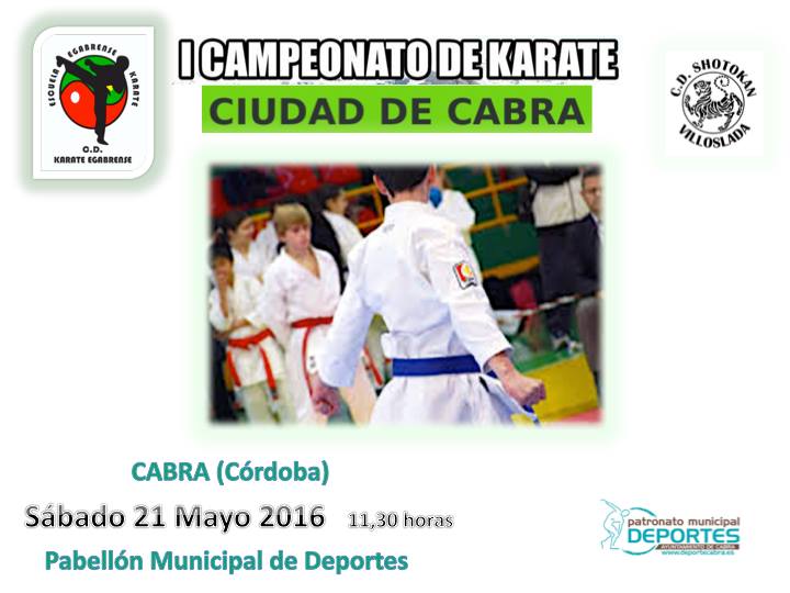 El próximo sábado día 21 de Mayo, tendrá lugar en el Pabellón Municipal de Deportes de Cabra el I Campeonato de Karate Ciudad de Cabra, organizado por el Club Egabrense de Karate, el Patronato Municipal de Deportes y el C. D. Shotokan Villoslada. En esta primera edición se darán cita un buen número de participantes procedentes de diferentes puntos de Andalucía y Portugal.