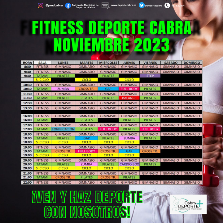 A partir del día 2 de Noviembre, el Programa Fitness Deporte Cabra verá incrementado su horario de clases para que podamos elegir con mayor amplitud y comodidad las sesiones que más nos interesen.