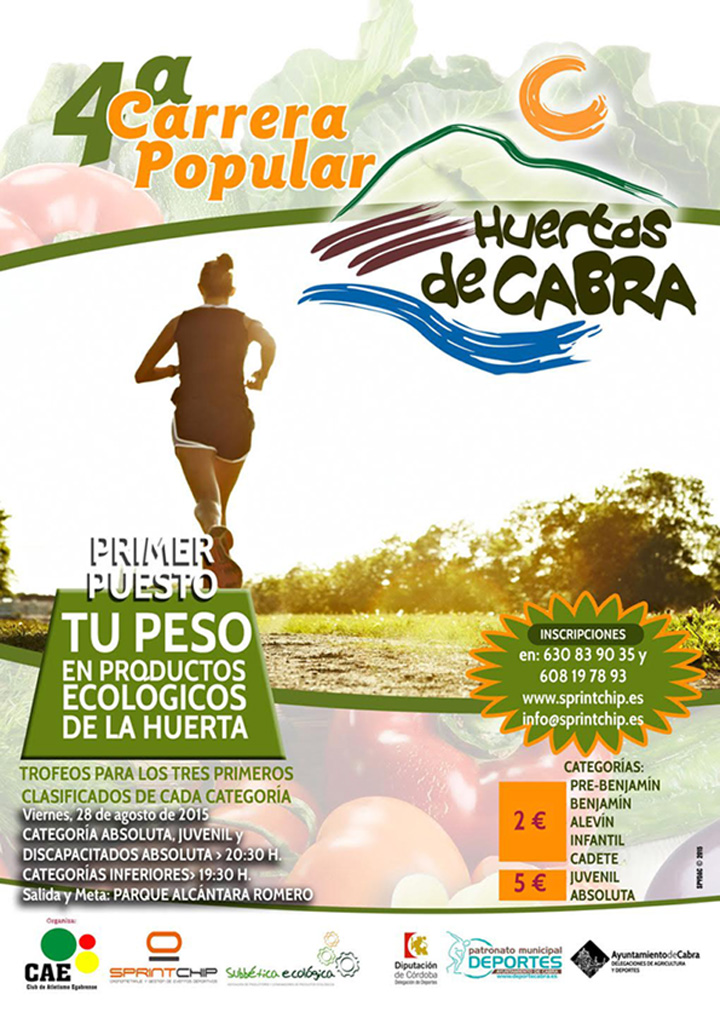 El próximo viernes día 28 de agosto se celebrará la cuarta edición de la Carrera Popular de las Huertas de Cabra, organizada por el Club Egabrense de Atletismo en colaboración con el Patronato Municipal de Deportes. Una prueba que en las tres ediciones celebradas hasta el momento se ha hecho con un importante hueco en el calendario anual, gracias a su buena organización y a la belleza del recorrido que ofrece: