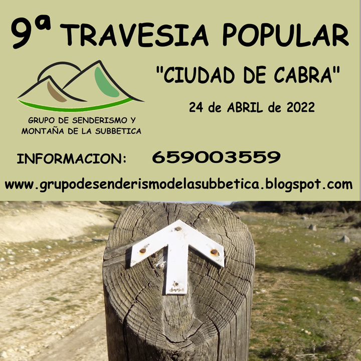 La IX edición de la Travesía Popular - Ciudad de Cabra - ya tiene fecha de celebración. Será el próximo día 24 de Abril de 2022. La actividad vuelve a estar organizada por el Grupo de Senderismo y Montaña de la Subbética en colaboración con el Patronato Municipal de Deportes y diversas entidades públicas y privadas de nuestra Ciudad.