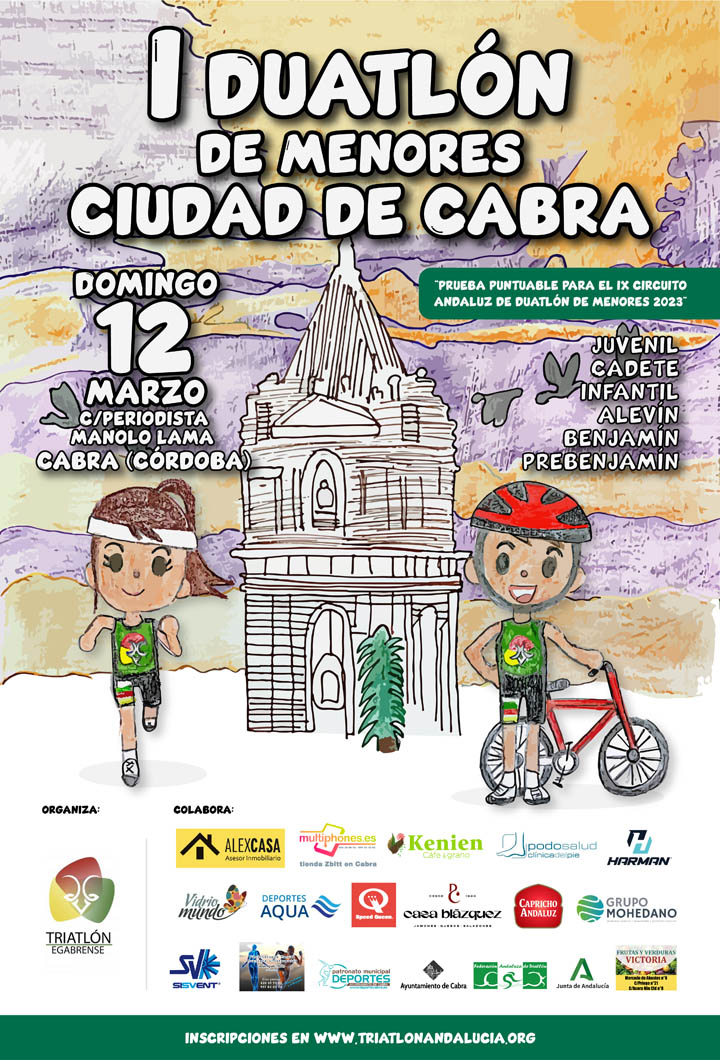 El próximo domingo 12 de marzo a partir de las 10.30 de la mañana, tendrá lugar en nuestra Ciudad, más concretamente en la Calle Periodista Manolo Lama, junto a la Ciudad de los Niños, el I Duatlón para Menores - Ciudad de Cabra - organizado por el Club Triatlón Egabrense y con la colaboración del Patronato Municipal de Deportes y varias firmas publicitarias.