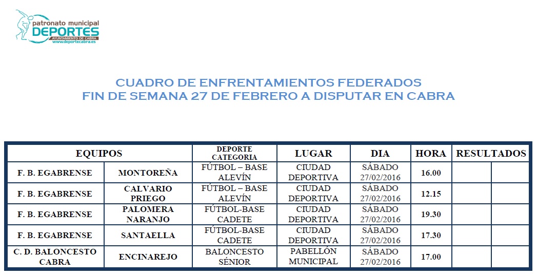 El Club Baloncesto Cabra comienza su andadura en el grupo de donde saldrán el Campeón y Subcampeón Provincial, y que además del título obtendrán una plaza de ascenso a Primera Nacional. Por su parte la Escuela de Fútbol Base Egabrense nos ofrecerá dos partidos de categoría alevín y otros dos de categoría cadete.