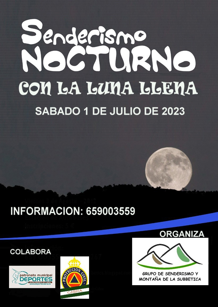 El Grupo de Senderismo y Montaña de la Subbética, vuelve a organizar en colaboración con el Patronato Municipal de Deportes del Ayuntamiento de Cabra y la Agrupación local de Protección Civil, el tradicional Senderismo Nocturno, que una vez más, nos llevará a recorrer rincones, senderos y lugares de nuestro entorno natural.