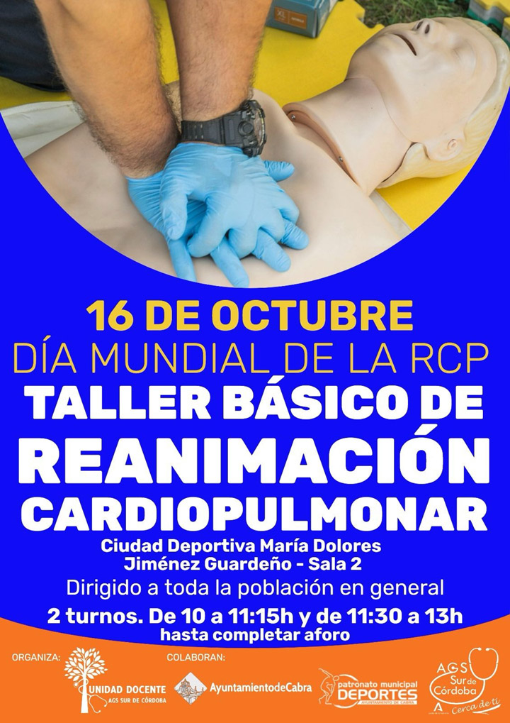 Con la organización de la Unidad Docente del AGS Sur de Córdoba y la colaboración del Ayuntamiento de Cabra a través de la Delegación de Deportes y su Área de Políticas Sociales se impartirá una jornada básica sobre la Reanimación Cardio Pulmonar, que en situaciones específicas es muy positiva y puede ayudar a cualquier persona a salvar la vida de otra que se encuentre en una situación crítica.