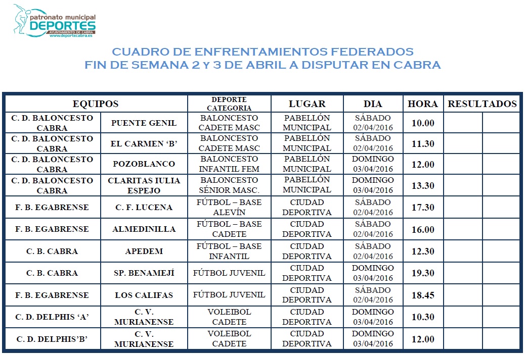 Balonmano, Voleibol, Baloncesto y Fútbol, a través de sus respectivos clubes deportivos nos ofrecerán sin duda un amplio abanico de encuentros donde destaca el encuentro de semifinales de ascenso a Primera Nacional, que disputará el equipo sénior del Club Baloncesto Cabra ante el actual campeón de la competición, Claritas Iulia de Espejo.