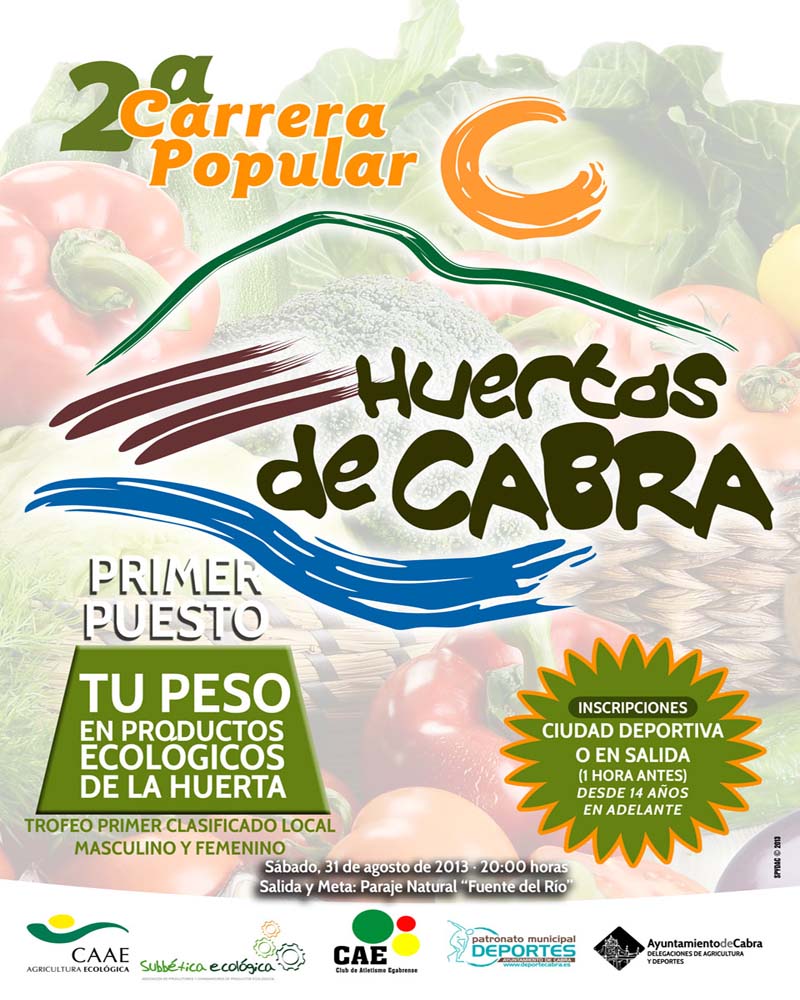 El día 31 de agosto a las 20,00 horas tendrá lugar en nuestra localidad la 2ª Carrera Popular "Huertas de Cabra". La salida de dicha prueba será en el paraje natural "Fuente del Río", la distancia aproximada de la prueba es de 7 kilómetros, la inscripción es GRATUITA y se podrán inscribir todos los deportistas mayores de 14 años.