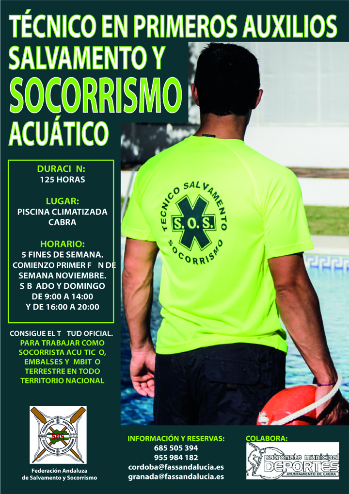 El próximo mes de noviembre, el Patronato Municipal de Deportes de Cabra en colaboración con la Federación Andaluza de Salvamento y Socorrismo, vuelve a organizar en la Piscina Climatizada de nuestra Ciudad, un curso de Formación en Técnico de Primeros Auxilios de Salvamento y Socorrismo Acuático.