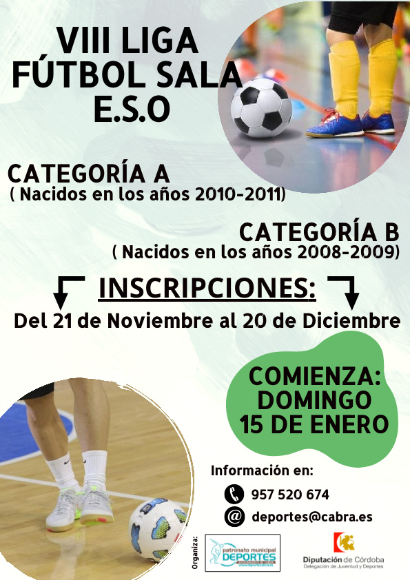 Hasta el 20 de Diciembre estará abierto el plazo de inscripción de participantes en la VIII edición de la Liga de Fútbol Sala, para estudiantes de la E. S. O. La Competición que organiza el Patronato Municipal de Deportes va consiguiendo un importante incremento de equipos desde su creación y este año se espera un nuevo récord de participación.