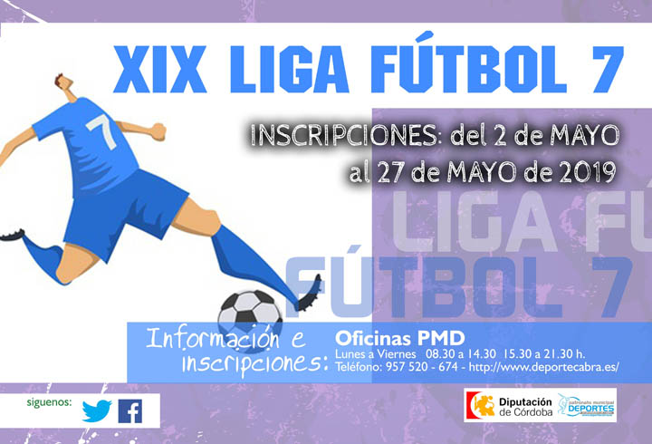 A partir del próximo jueves día 2 de mayo, se abrirá el plazo de inscripción de equipos en la XIX edición de la Liga local de Fútbol 7 que organiza el Patronato Municipal de Deportes y que se desarrollará íntegramente en las instalaciones de la Ciudad Deportiva.