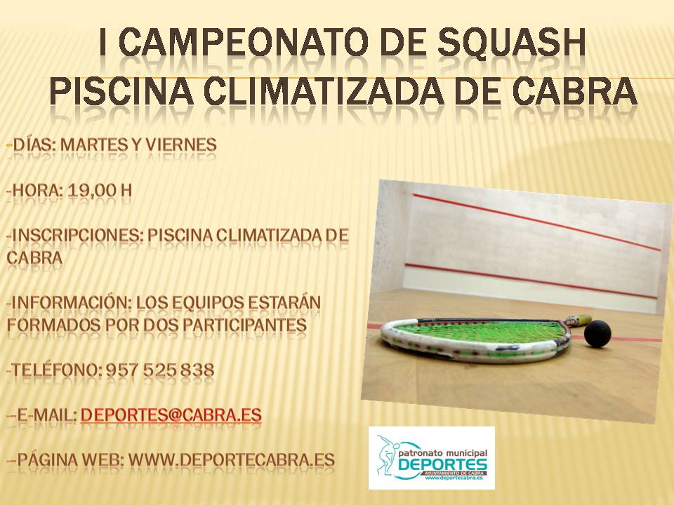 En los próximos días se pondrá en marcha la I Liga de Squash del Patronato Municipal de Deportes. Las inscripciones se pueden realizar en las propias instalaciones de la Piscina Climatizada o bien por correo electrónico en la dirección deportes@cabra.es