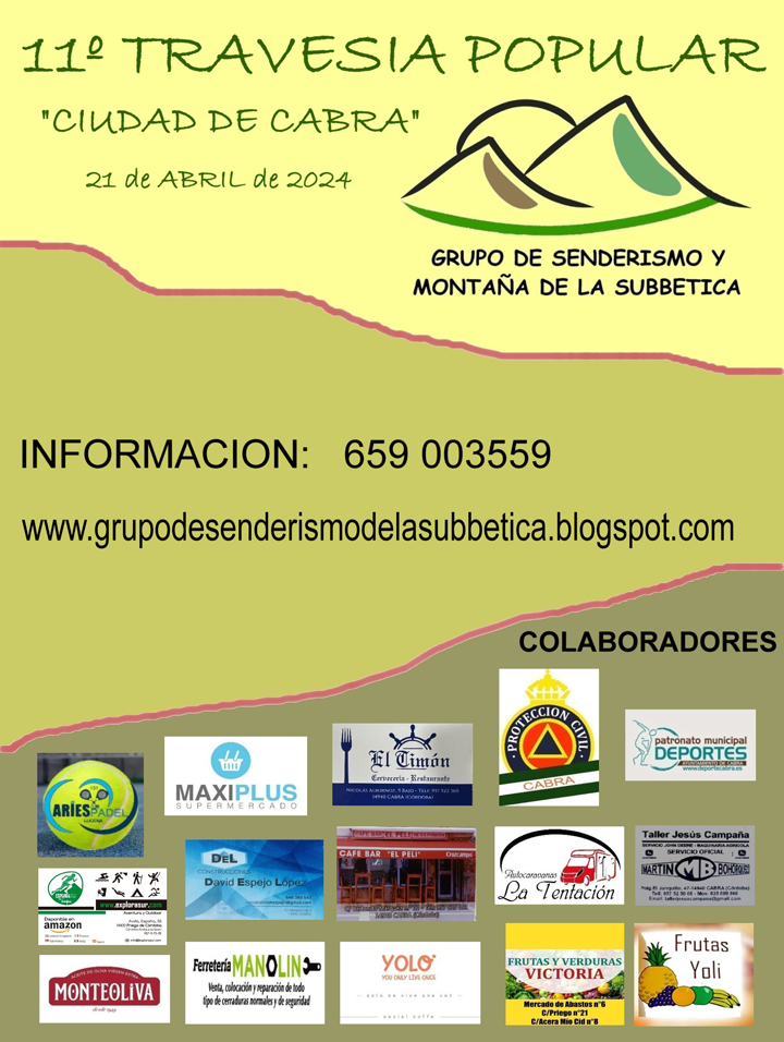 Hasta el próximo día 14 del presente mes o bien hasta completar las 50 plazas que hay disponibles en esta edición, estará abierto el plazo de inscripción en la undécima edición de la Travesía Popular Ciudad de Cabra, que organiza el Grupo de Senderismo y Montaña de la Subbética en colaboración con el Patronato Municipal de Deportes de Cabra, junto con el Ayuntamiento y diversas entidades privadas.