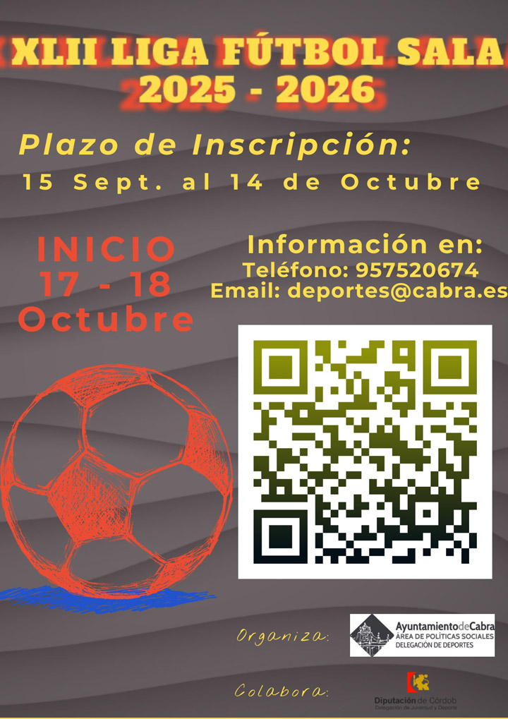 Desde el 15 de Septiembre y hasta el próximo día 14 de octubre estará abierto el plazo de inscripción de equipos para participar en la 42ª edición de la Liga de Fútbol Sala de Cabra de categoría absoluta que organiza y desarrolla la Delegación de Deportes del Ayuntamiento de Cabra. Sin duda una de las competiciones más veteranas de cuantas se disputan en la Provincia dentro de esta disciplina deportiva.