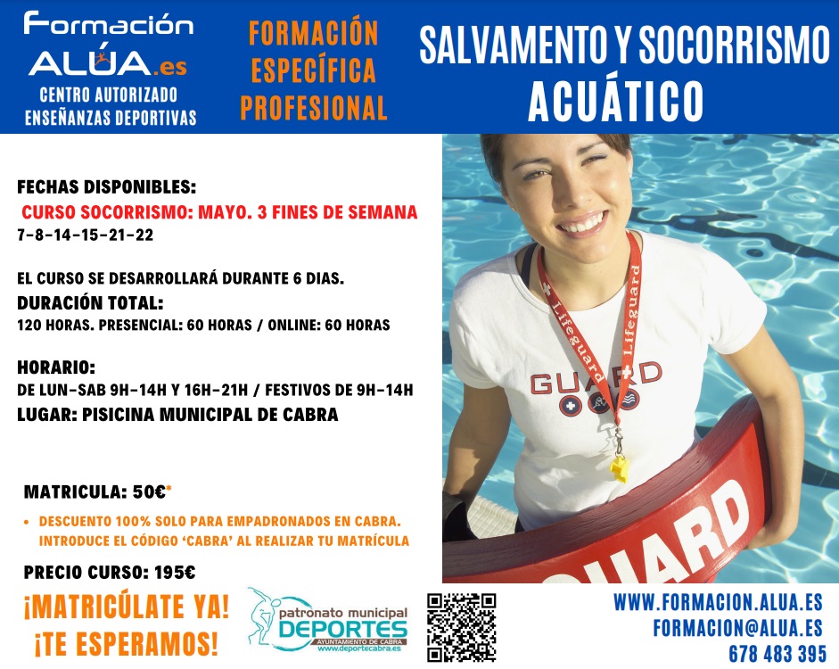 Este fin de semana dará comienzo el Curso de Salvamento y Socorrismo Acuático, que se desarrollará en las instalaciones de la Piscina Climatizada de Cabra y que constará de un total de 120 horas, de las cuales la mitad serán presenciales y el resto Online.