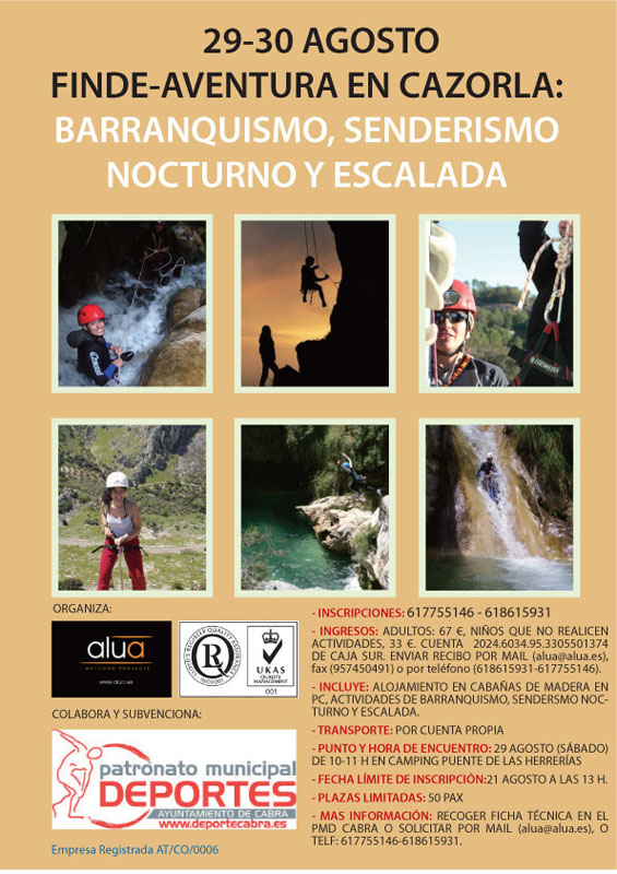 Hasta el 21 de agosto permanece abierto el plazo de inscripción para participar en un fin de semana de aventura en Cazorla, una actividad que incluye barranquismo, senderismo nocturno y escalada y que se realizará durante los días 29 y 30 de agosto, organizada por Alúa con la colaboración del Patronato Municipal de Deportes de Cabra.