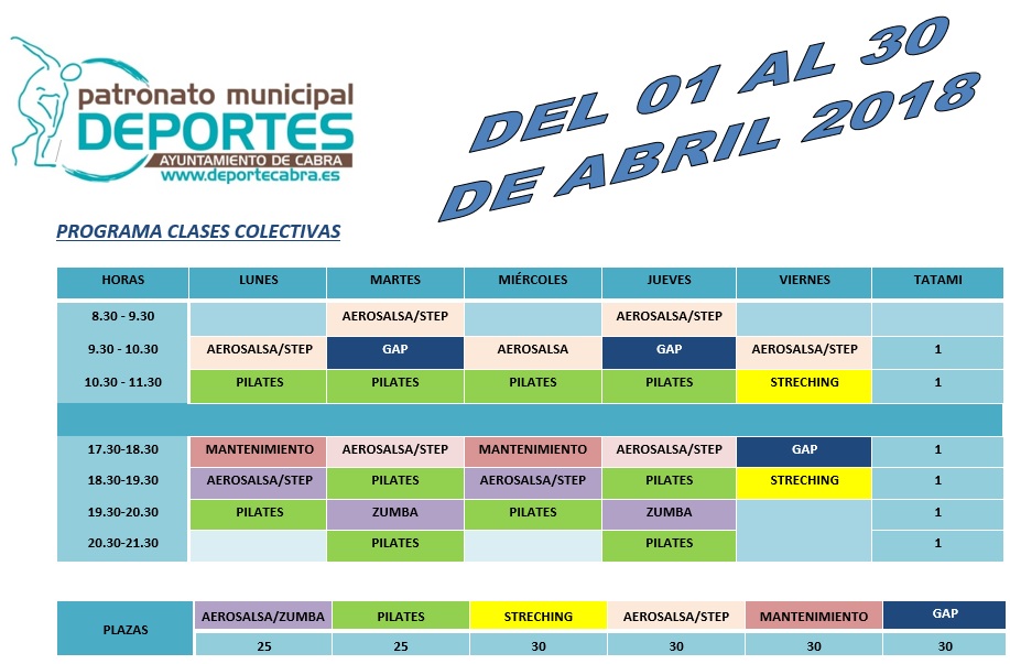 El programa de Adultos denominado Clases Colectivas que se desarrolla en la Ciudad Deportiva Mª Dolores Jiménez de Cabra, nos ofrece para el próximo mes de abril la incorporación de dos horas más de actividades. Concretamente será la disciplina de Pilates, la que se isume a este programa tanto los martes como los jueves en el horario de 10.30 a 11.30.