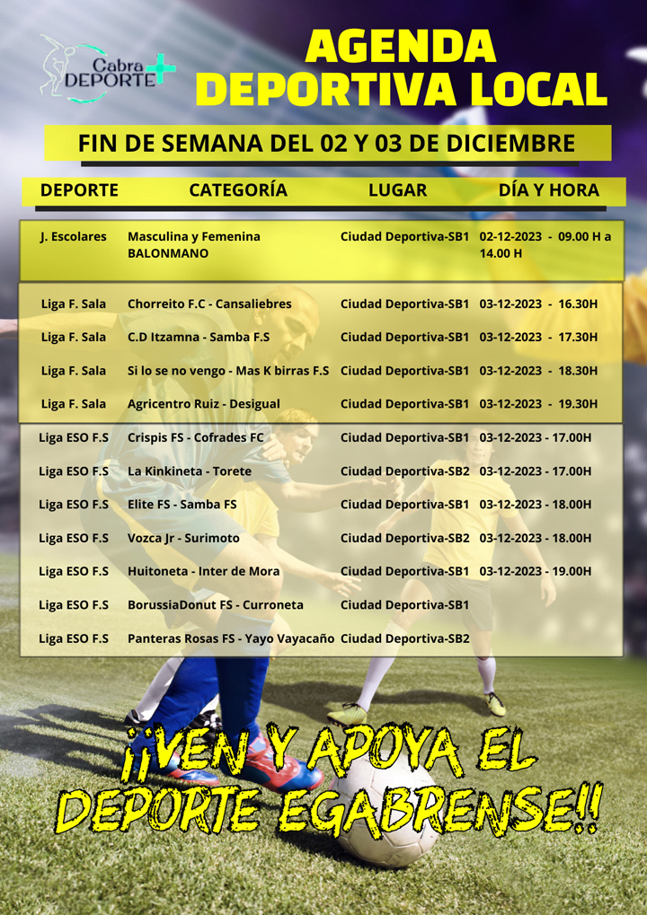 Por su parte, las competiciones locales tendrán al Fútbol Sala como gran representante, ya que tanto la Liga local de Adultos como la Liga de los Institutos ocuparán el mayor espacio del tiempo. La mañana del sábado tiene el espacio reservado los Juegos Escolares, con la modalidad de Balonmano.