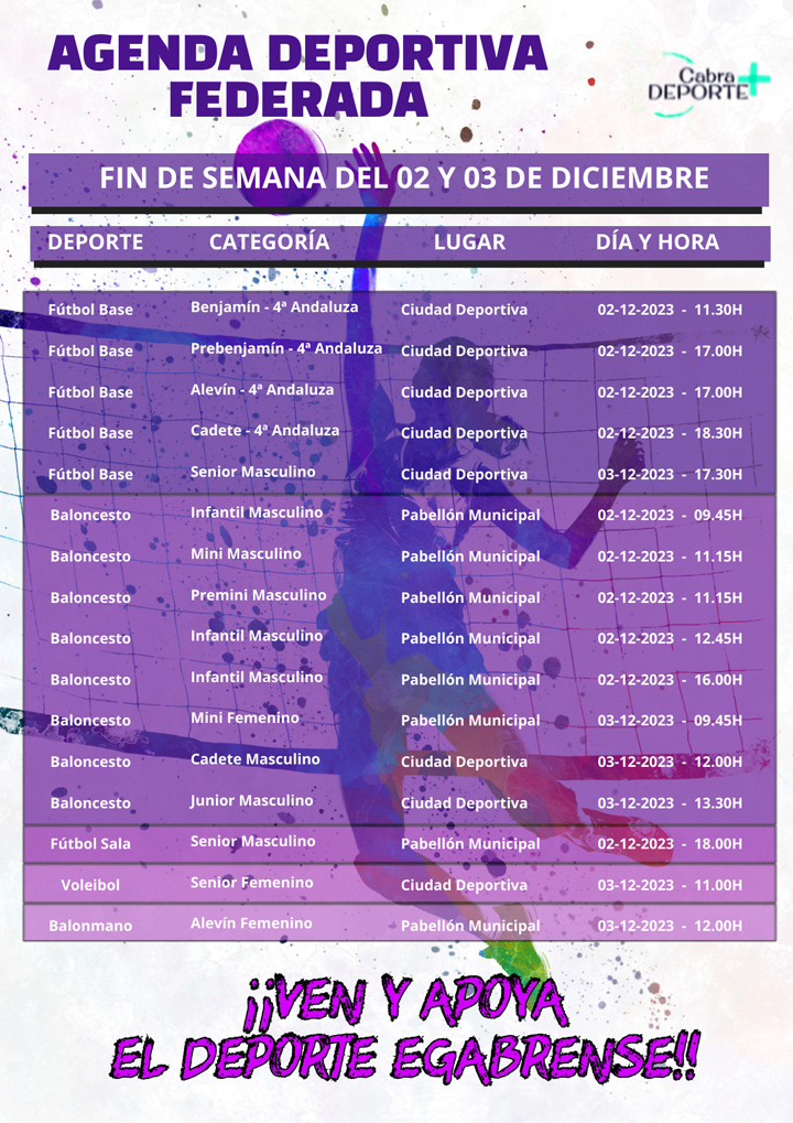 Apenas habrá descanso para las instalaciones deportivas, ya que el fin de semana se avecina repleto de enfrentamientos tanto federados como locales. Entre los federados encontramos con partidos de todas las disciplinas deportivas, siendo el baloncesto, la disciplina con mayor número de partidos, seguidos por el Fútbol Base. Por su lado el Fútbol Sala, el Voleibol y el Balonmano tendrán un encuentro cada uno de ellos.