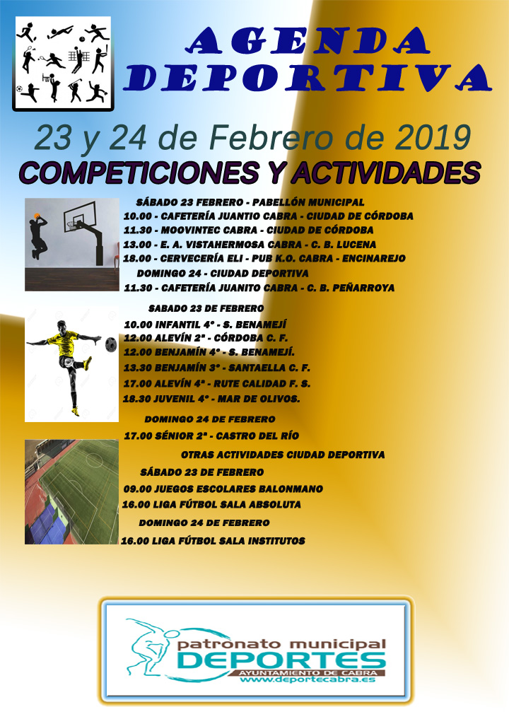 Además de los emparejamientos a nivel federado, no pierden nuestro interés las competiciones locales que siguen a buen ritmo. Juegos Escolares, y las ligas de fútbol sala, celebrarán una jornada más en sus respectivas competiciones, todos ellos en la Ciudad Deportiva de Cabra.