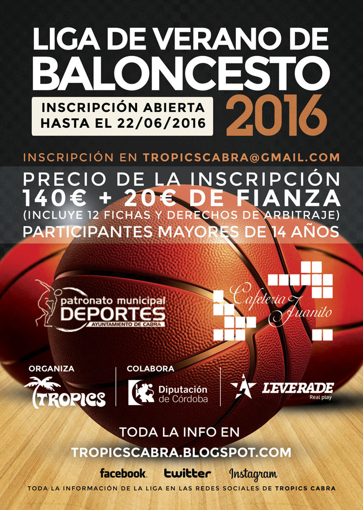 Junto con el Patronato Municipal de Deportes de Cabra, el C. D. Tropics presidido por Manuel Cáliz, organizará por segundo año consecutivo la Liga de Verano de Baloncesto en categoría absoluta y a celebrar en el Pabellón Municipal de Deportes a partir del próximo día 28 de Junio. En el apartado de DESCARGAS puedes encontrar Documentación e Información de esta competición.