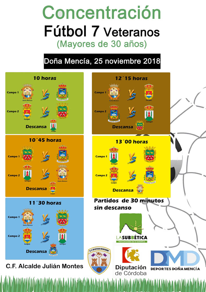 El próximo domingo día 25 se celebrará en la vecina localidad de Doña Mencía la I Concentración de equipos de Fútbol -7 en la categoría de Veteranos, y donde Cabra tendrá a un representante. Junto a nuestra Ciudad, también participarán Fuente Tójar, Iznájar, Luque y la organizadora, Doña Mencía.