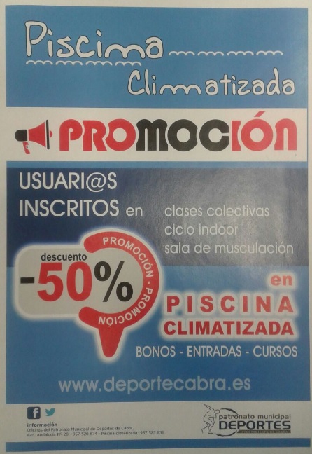 Desde el Patronato Municipal de Deportes se informa de la PROMOCIÓN que se ofrece para el uso de la Piscina Climatizada de Cabra. Los usuari@s inscritos en las actividades de la Ciudad Deportiva, es decir, Clases Colectivas, Ciclo Indoor y Sala de Musculación, tendrán un descuento del 50% en los accesos a dicha instalación, ya sea a través de Bonos, Entradas o Cursos.