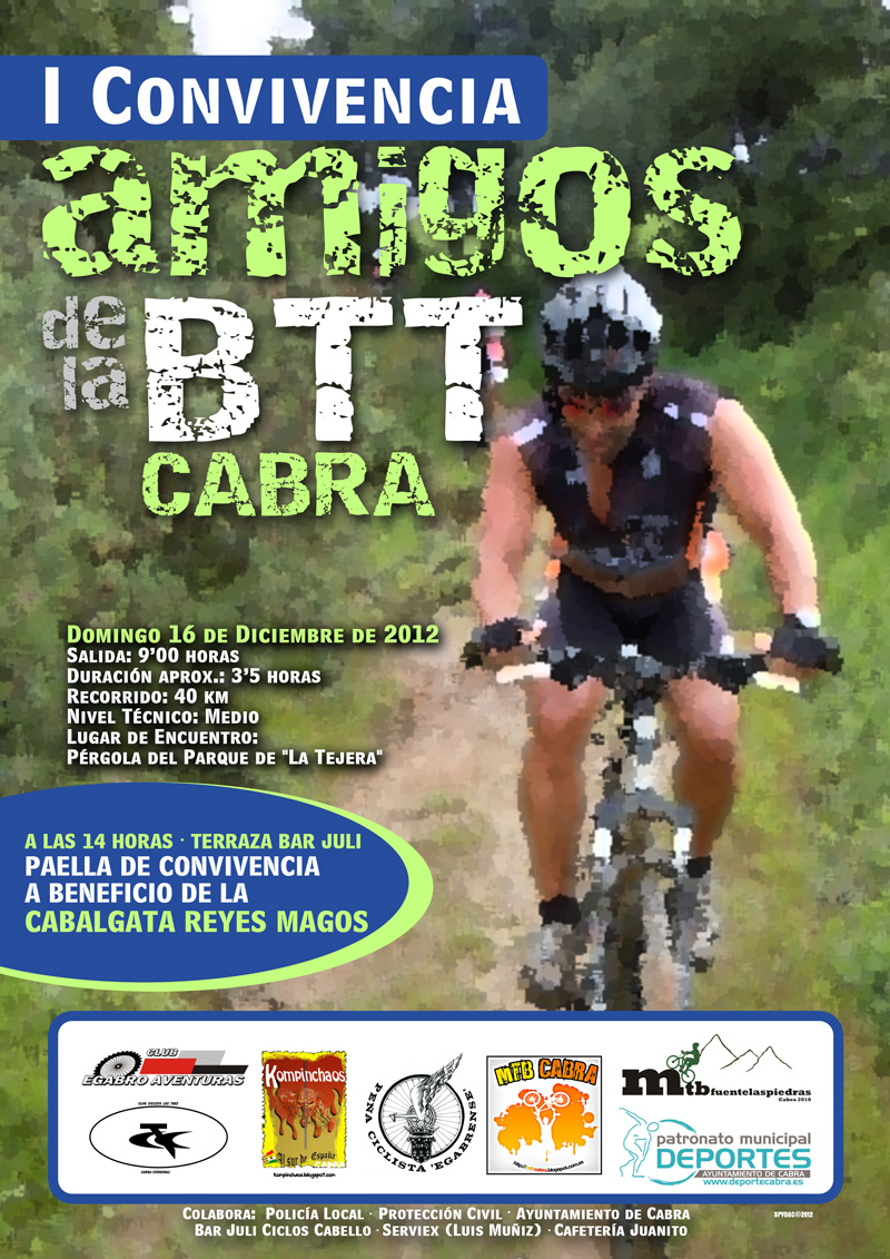El Patronato Municipal de Deportes de Cabra junto con las distintas asociaciones, peñas, colectivos y clubes deportivos de nuestra Ciudad que fomentan las diversas disciplinas de la bicicleta, han organizado una Jornada de Convivencia en torno a ella y además con el objetivo de obtener recaudar fondos en beneficio de la Cabalgata de Reyes Magos. La jornada se desarrollará a través de un recorrido muy asequible a todo tipo de participantes, donde familias enteras podrán disfrutar de un agradable día en unas fechas muy significativas. La concentración se realizará en la Pérgola del Parque de la Tejera a las 9 de la mañana.
