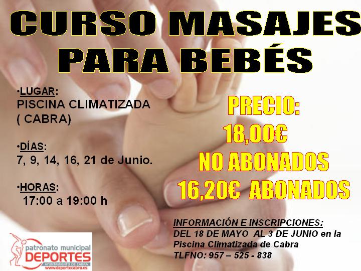 Desde el pasado lunes está abierto el plazo de inscripción para el Curso de Formación que está indicado para Masajes a Bebés. El Curso se impartirá los días 7, 9, 14, 16 y 21 de Junio en las instalaciones de la Piscina Climatizada, y está abierto a la participación de todas aquellas personas interesadas en el tema.