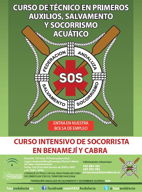 Desde el domingo día 13 de Abirl y durante la Semana Santa se llevará a cabo un Curso Intensivo para formar Técnicos en Primeros Auxilios, Salvamento y Socorrismo Acuático a través de la Federación Andaluza de Salvamento y Socorrismo. Las sesiones se impartirán en el Camping Rafting de Benamejí y la Piscina Climatizada de Cabra. Los teléfonos de información y reservas son: 955.984.182 y 685 505.394