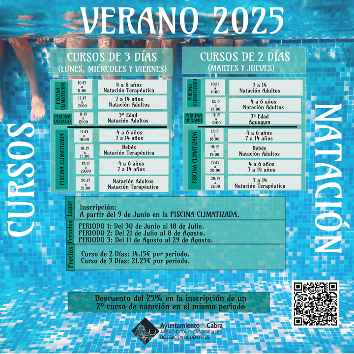 Será en la oficina de la Piscina Climatizada donde se podrán realizar las inscripciones en los Cursos de Natación para el Verano 2025, organizados por la Delegación Municipal de Deportes del Ayuntamiento de Cabra, y que cada año se convierte en un fijo en cuanto a actividades deportivas y de formación se realizan en el verano.