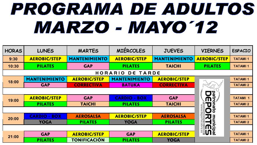La inscripción en este programa se puede realizar durante estos días en la Oficina del Patronato Municipal de Deportes en la Ciudad Deportiva 'Mª Dolores Jiménez Guardeño' y desde el próximo 1 de Marzo, los deportistas podrán disfrutar y ponerse en forma con esta variada oferta que posee el Programna de Adultos de cara a los meses de Marzo, Abril y Mayo.