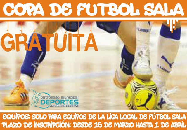 El Patronato Municipal de Deportes pondrá en marcha próximamente la Copa de Fútbol Sala que será totalmente gratuita para los participantes. El plazo de inscripción para los equipos comienza el día 16 de Marzo y finalizará el 1 de Abril.