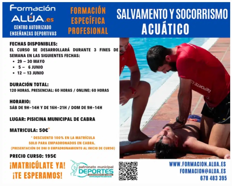 En tres fines de semana se desarrollará el Curso de Salvamento y Socorrismo que se impartirá en las instalaciones de la Piscina Climatizada de Cabra. El Curso está organizado por la Empresa Alúa, con la colaboración del Patronato Municipal de Cabra y a quienes lo superen obtendrán la titulación necesaria para trabajar en Piscinas, Playas, Parques acuáticos o Piscinas naturales.