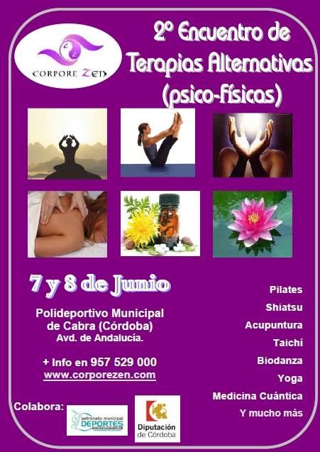 La Ciudad Deportiva vuelve a acoger el 2º Encuentro de Terapias Alternativas (Psico-Físicas) que organiza el Club Corpore Zen en colaboración con el Patronato Municipal de Deportes de Cabra y la Diputación de Córdoba y que se celebrará los próximos días 7 y 8 de junio y donde se impartirán disciplinas como Pilates, Shiatsu, Acupuntura, Taichi, Biodanza, Yoga, Medicina Cuántica y otras.