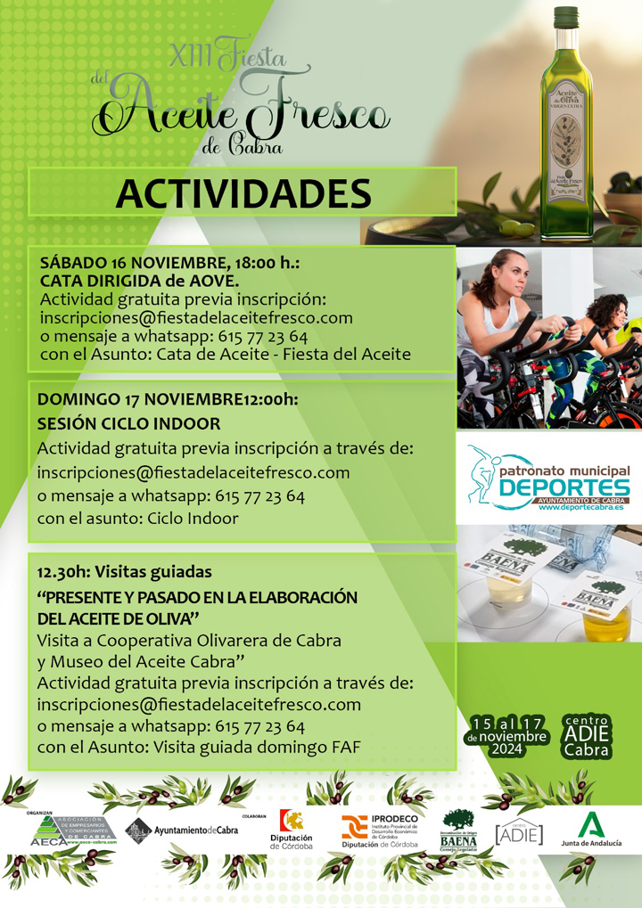 La sesión se desarrollará a las 12.00 horas el domingo día 17 de noviembre, y la inscripción se podrá realizar a través de los medios que se indican en el cartel anunciador de la Fiesta del Aceite Fresco.