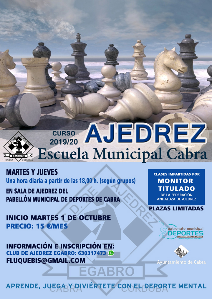 Desde el día 1 de Octubre, estará en marcha la Escuela Municipal de Ajedrez, que desarrolla el Club Egabro Ajedrez en colaboración con el Patronato Municipal de Deportes. Las clases se impartirán por un Monitor Titulado en esta disciplina y las sesiones serán en la Sala de Ajedrez del Pabellón Municipal de Deportes.