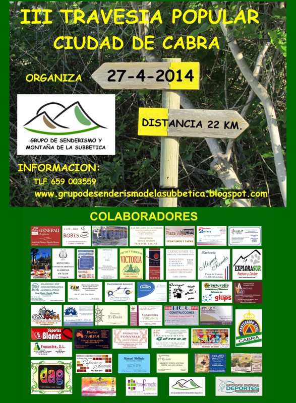 El próximo día 27 de abril el Grupo de Senderismo y Montaña de la Subbética organiza la III Travesía Popular 'Ciudad de Cabra' que tendrá como escenario principal a las diversas zonas y parajes del Parque Natural de las Sierras Subbéticas. Los participantes completarán un recorrido aproximado de 22 kilómetros, partiendo de la Estación del Tren del Aceite a las 7.30 horas.
